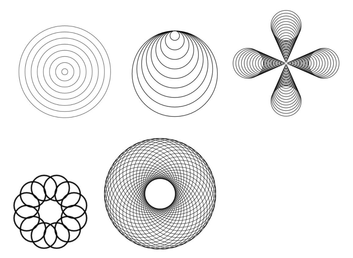 Practice creating the following shapes using a while loop. The first three shapes are recommended for everyone. The last two (spirograph ones) are optional. If you pursue the latter two, see if you can get implementation ideas here (or using some other source).